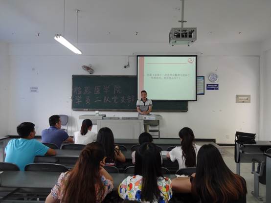 2017年6月26日下午四点三十分,检验医学院二队党支部在教学楼B205教室举行了以“省第十一次党代会精神与实际工作相结合,党员怎么办”为主题的党课。本次党课由党委副书记郑崛村同志主讲,参与此次党课的还有党支部书记周新格老师和宣传委员蒋继锋老师以及全体学生党员。