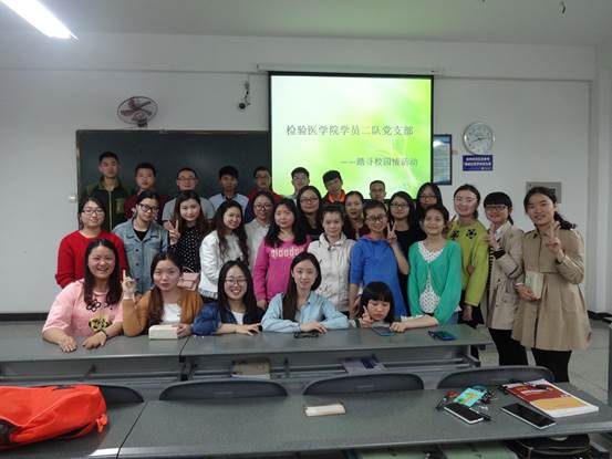 为进一步促进党员之间的交流,提高党员的团结协作能力。4月18日,检验医学院学员二队党支部于教学楼B410举办了以“ 踏寻校园情”为主题的支部活动。