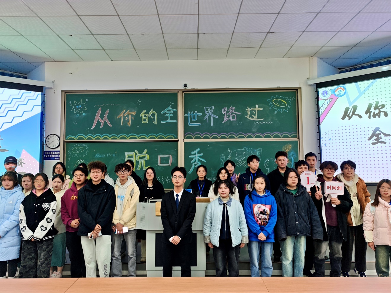 活动开始,主持人用慷慨激昂的开场白拉开了活动的序幕。在主持人详细介绍了本次脱口秀的规则及评分标准,确保每位选手及现场观众都能全面了解活动后,活动正式进入了最精彩的展示环节。选手们依次登台,带着精心打磨了许久、反复调整过细节的脱口秀脚本,笑着向大家分享那些藏在日常里的趣事——也许是课堂上的小插曲,又或是和朋友一起闹出的搞笑乌龙,用接地气的幽默语言、充满感染力的生动演绎,相得映彰的有趣手势,自然又鲜活地展现出了自身的独特风采。所有选手展示完毕后,评委根据选手表现,语言风格,故事价值等多方面考量,进行了综合打分。片刻后,主持人宣布了最终成绩,获奖选手们依次上台领奖,随着所有脱口秀选手与全体工作人员合影留念,本次活动圆满收官。
