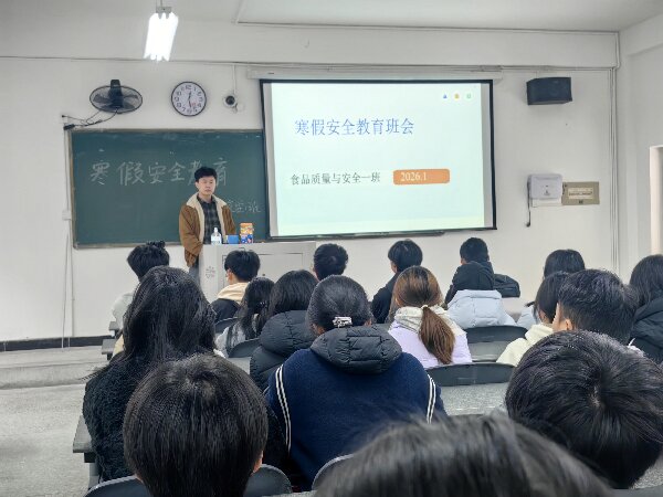 为强化同学们假期安全防护意识,确保全体同学度过平安祥和的寒假,2026年1月7日,23级食安1班于博学楼A111教室召开寒假安全教育班会。本次班会由班长余颖棚主持,食安1班全体同学参与。