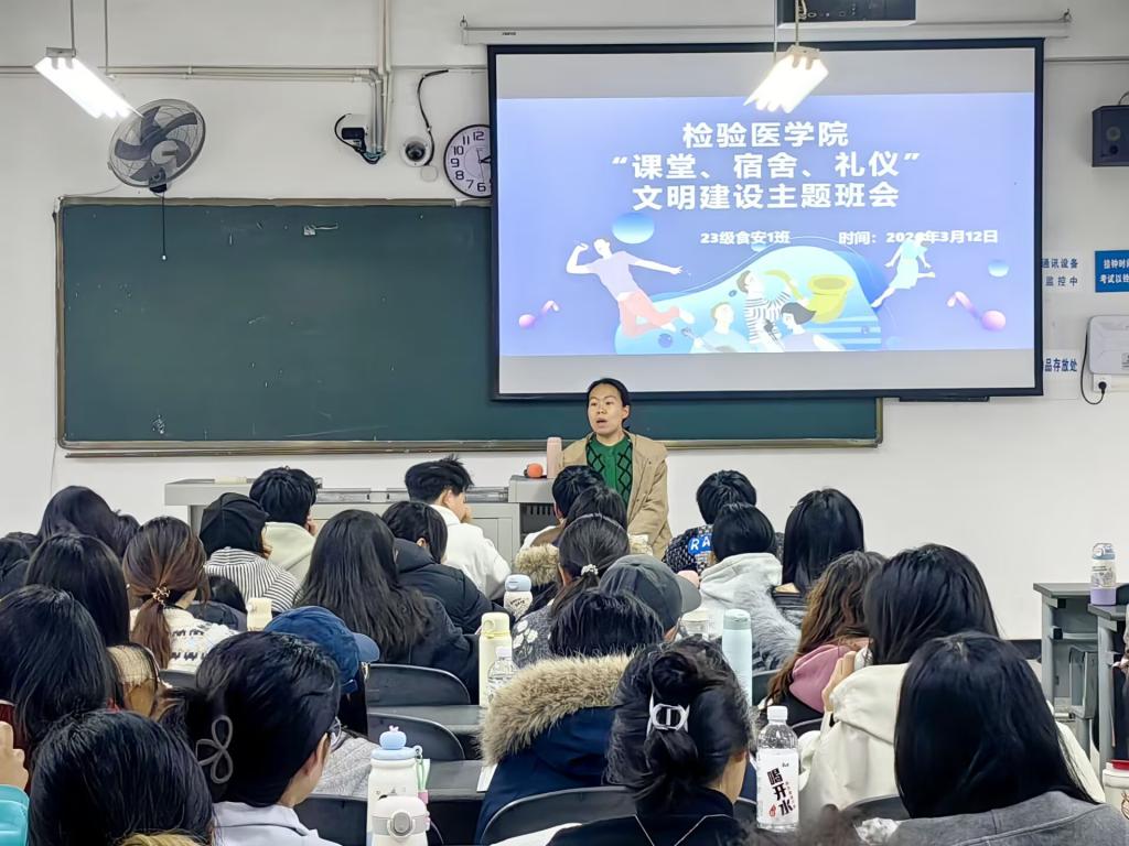 会上,杨颖围绕课堂文明、宿舍文明、礼仪文明三大核心板块,带领同学们系统学习了文明校园建设的具体要求。在课堂文明方面,重点强调了考勤纪律、课堂规范,号召同学们按时上下课、专心听讲、诚信应考,自觉维护良好的课堂秩序;在宿舍文明建设中,明确了安全纪律、内务卫生与优良舍风的标准,杨颖辅导员提醒同学们杜绝违规电器与不文明行为,共建整洁有序、互助向上的宿舍环境;在礼仪文明层面,引导大家注重仪容仪表,使用文明用语,主动问好、礼让他人,在人际交往中践行谦和友善的医学生素养。