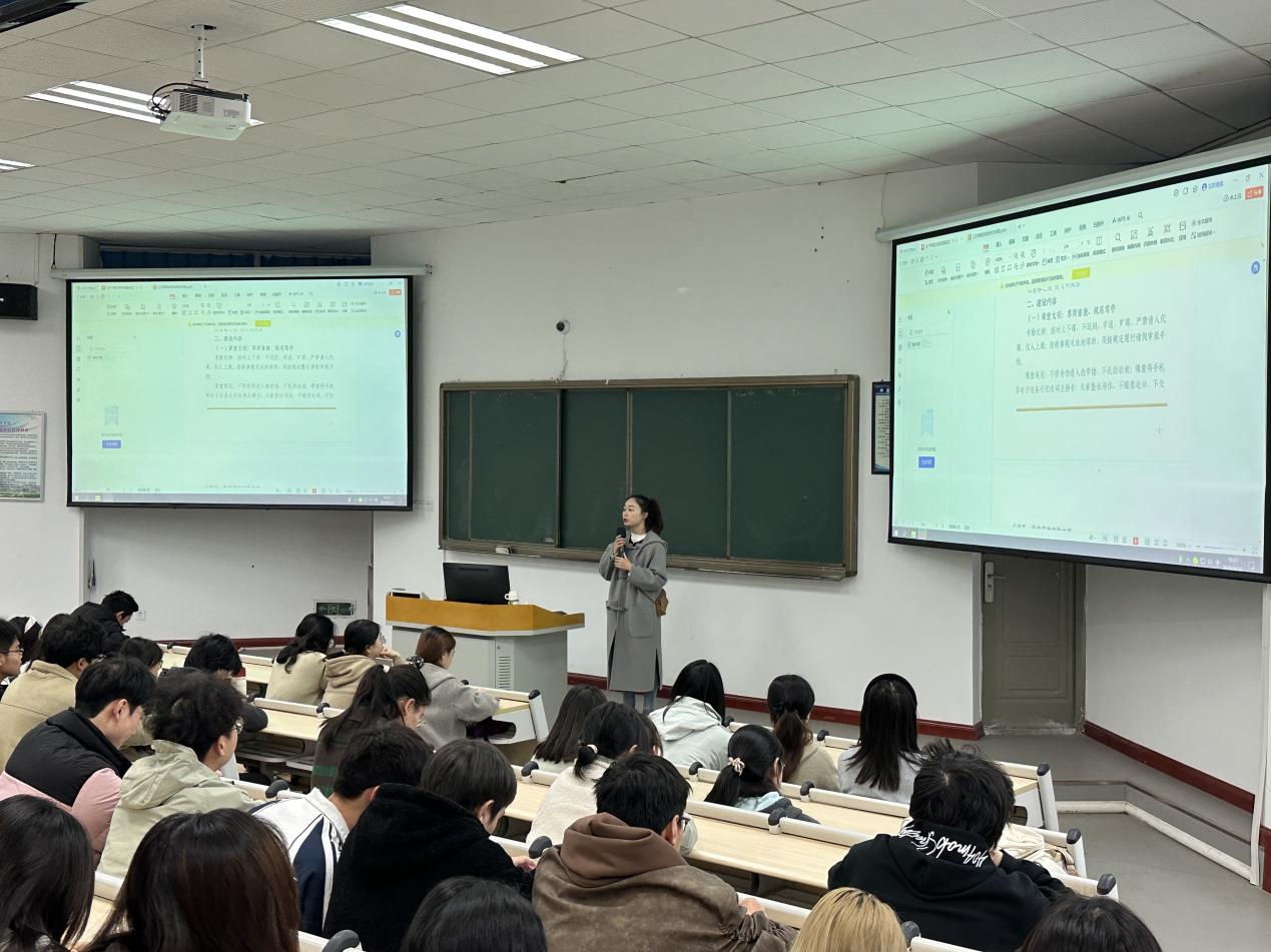 在纪律要求环节,乔静老师结合23级学生近期的日常表现,重申了考勤制度、课堂规范、宿舍安全卫生等管理规定。她强调,严禁迟到早退、旷课、请人代课;严禁在宿舍使用违规电器、私拉乱接电线;严禁晚归、不假外宿、留宿外人;严禁酗酒、赌博、饲养宠物等行为。同时,她通报了学院近期督查中发现的问题,对表现优秀的宿舍和个人提出表扬,对存在不足的班级提出整改要求。她鼓励学生党员、学生干部带头践行“三个文明”,主动向老师同学问好,发挥示范引领作用,带动身边同学共同进步。