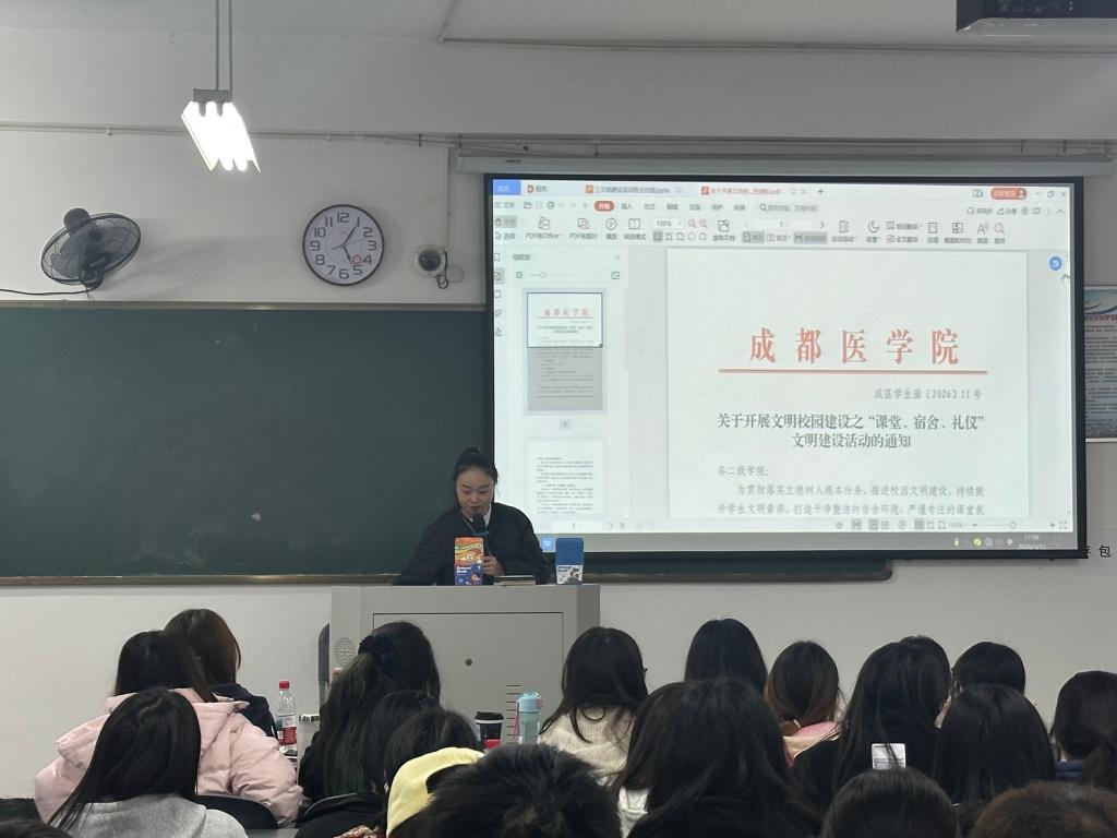 为深入推进文明校园创建,强化学生文明素养培育,彰显医学生“精医、尚德、求实、自强”的精神风貌,3月12日,辅导员乔静于成都医学院博学楼A106开展“以青春之我 创文明成医”主题班会,围绕课堂、寝室、礼仪三大文明核心,明确要求、凝聚共识,引导学生将文明理念内化于心、外化于行。