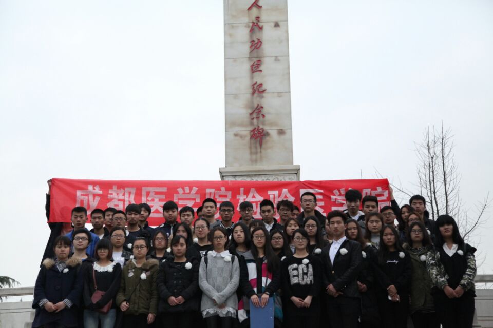 “桃花红雨英雄血,碧海丹霞志士心。今日神州看奋起,陵园千古慰忠魂”。在一年一度的清明节来临之际,2016年3月27日上午,为缅怀革命先烈,弘扬爱国主义精神,检验医学院团委和学生会在在新都烈士陵园举行“缅怀先烈 祭奠英灵”的扫墓活动。生会主席张航、团委副书记李铭以及各部门的学生代表参加了这场扫墓活动。