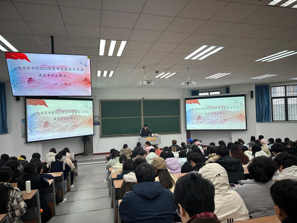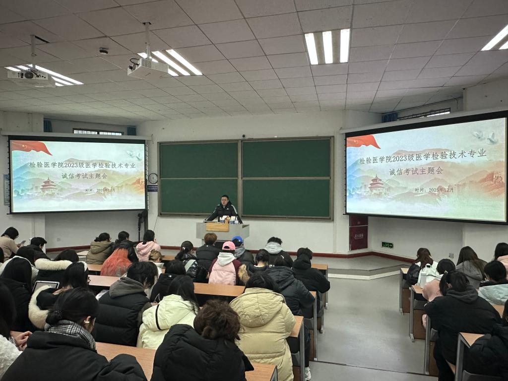 临近期末,为营造风清气正的备考氛围,强化学生诚信意识,2023级医学检验技术专业于近日在教学楼B109教室召开诚信考试主题班会。会议由年级辅导员主持,全年级同学悉数参会。