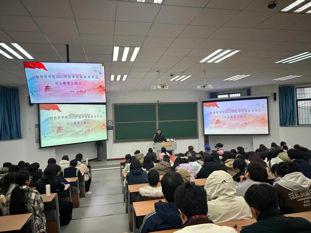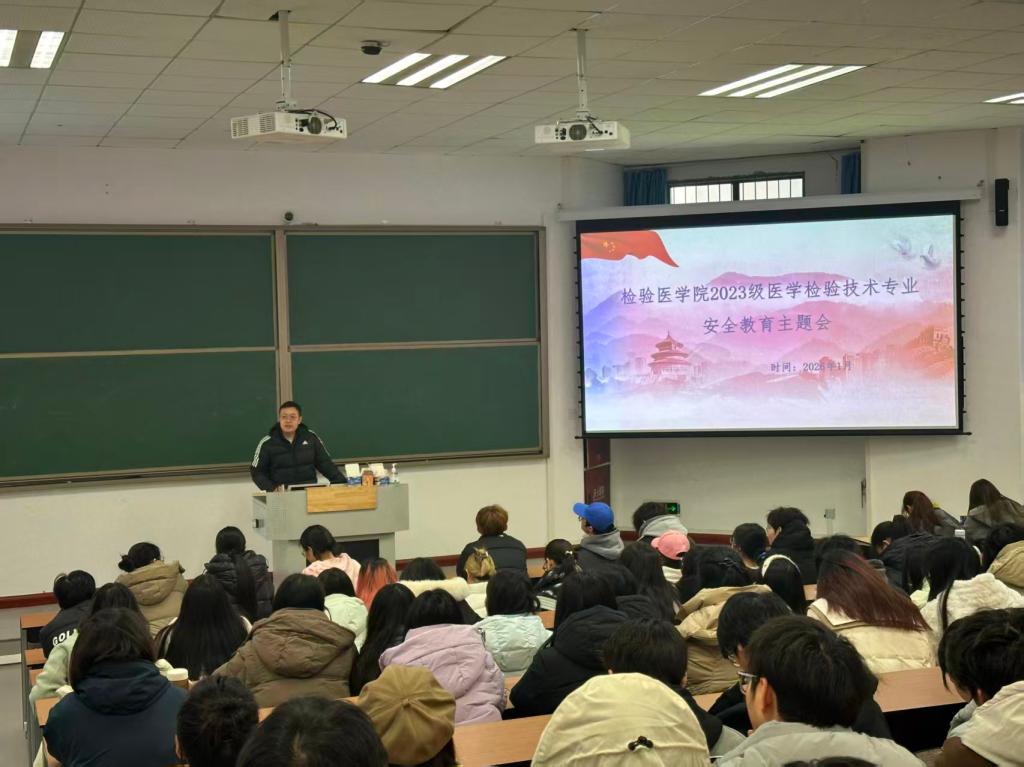 为增强学生安全意识,确保全体同学度过一个平安、稳定、祥和的寒假,1月6日,检验医学院2023级医学检验技术专业在教学楼B109教室召开寒假安全主题班会。会议由年级辅导员主持,全年级同学共同参加。