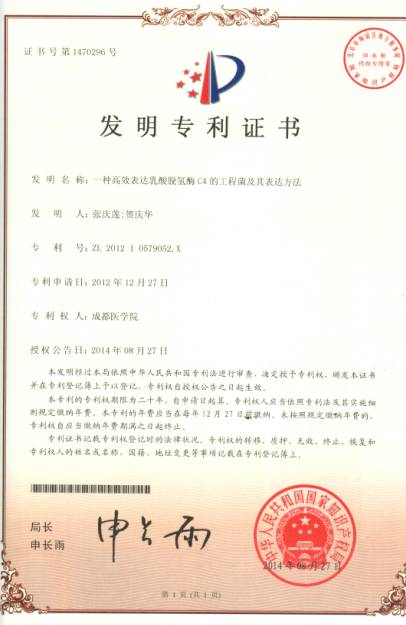 日前,国家专利局传来喜讯,成都医学院检验医学院张庆莲博士的一项发明专利获得授权,专利名称为:“一种高效表达乳酸脱氢酶C4的工程菌及其表达方法”,专利号为:201210579052.X。