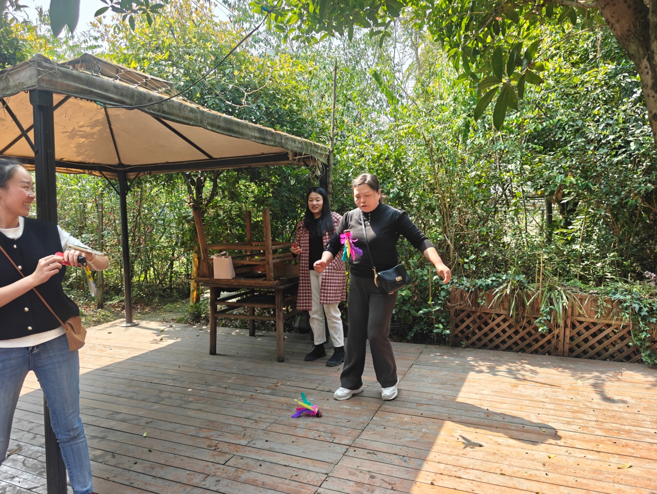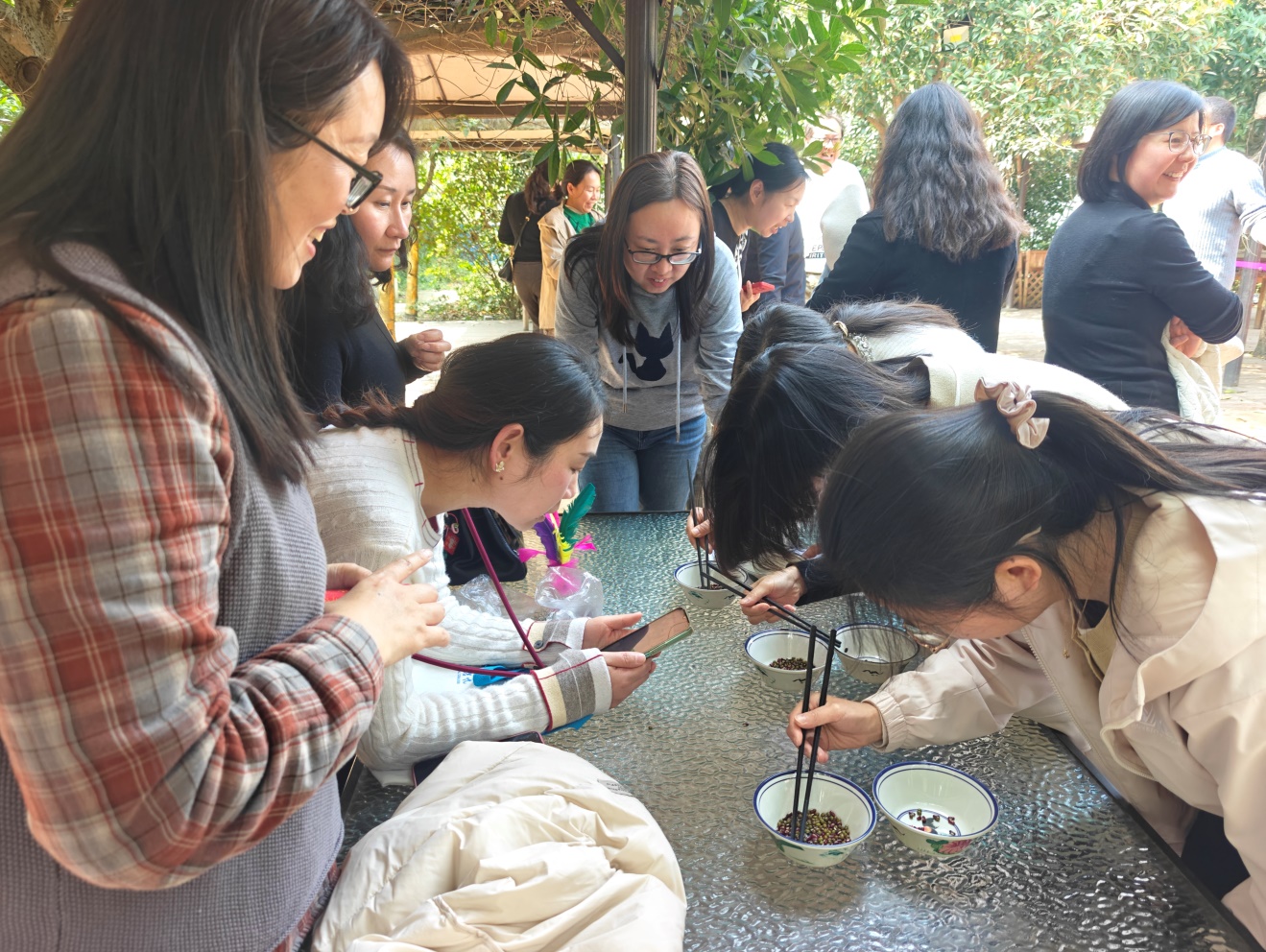 活动伊始,教职工们结伴漫步于春日景致中,赏繁花绿意、沐和煦春风,卸下工作的疲惫,畅谈工作生活点滴,欢声笑语萦绕其间,尽显轻松愉悦的氛围。午饭后,趣味文体活动火热开启,学院精心设置了“跳绳、踢毽子、颠羽毛球、夹弹珠、分拣红豆绿豆”等多项兼具趣味性与互动性的休闲项目,贴合教职工日常作息,兼顾运动性与趣味性,无激烈竞技压力,全员均可轻松参与。